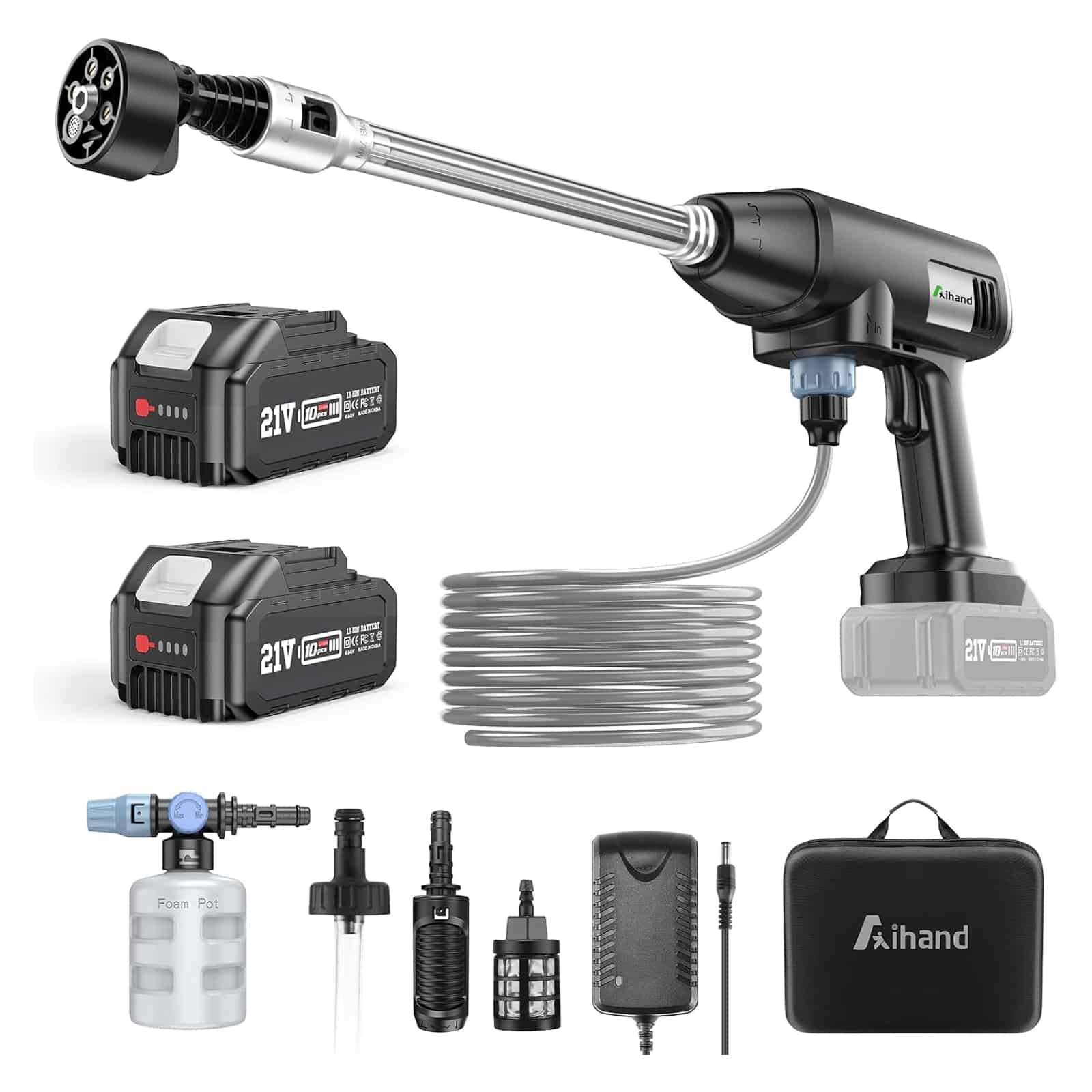 The Aihand Battery Powered Pressure Washer delivers impressive power with its 986 PSI motor, making it one of the stronger cordless options available. The dual 4.0Ah battery system provides extended runtime, offering about 90 minutes of continuous use - a significant advantage over single-battery models.